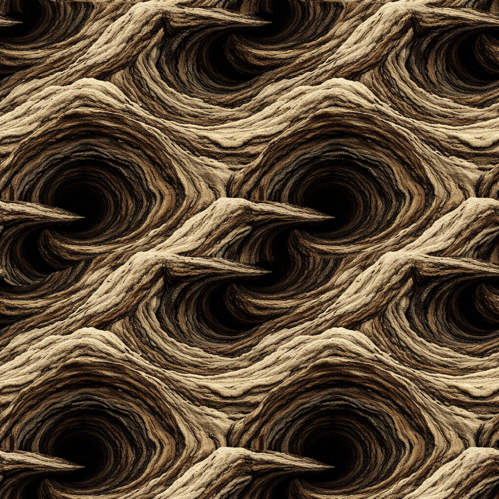 - Visual: Layered geological bands compressed inward, subtle curvature implying a mouth without showing one